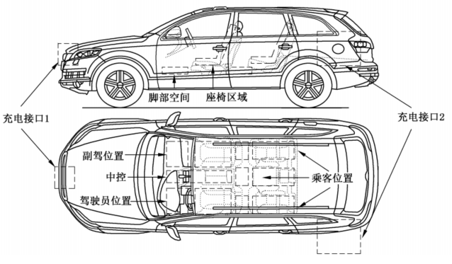 ②位置的测试则分为行驶状态测量位置及充电状态测量位置,分别包括驾驶员位置、乘客位置以及充电接口区域。