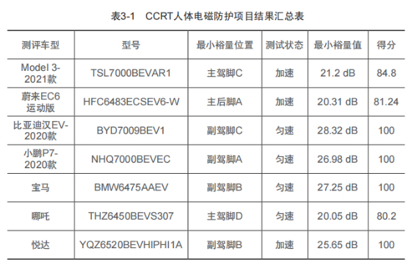 据中汽中心《中国汽车测评蓝皮书》中显示,CCRT在2020年引入了“人体电磁防护”指标,依据《车辆电磁场相对于人体曝露的测量方法》进行人体电磁防护试验,测量车辆在匀速、加速、减速、充电工况下车内和车外充电接口处等驾乘人员经常接触到的各位置点的磁场辐射值。