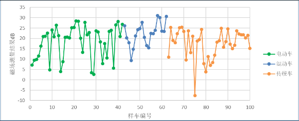 中汽中心牵头对100款不同驱动类型的车辆进行了摸底测试。摸底测试依据比国标更为严格的CCRT测试规程开展,其中“磁场测量结果”为测量数据与国标电磁辐射安全上限的差值,纵坐标“0”代表刚刚满足国标要求,负值为超标,正值越大电磁辐射安全裕量越多。测试结果表明,电动汽车和混合动力汽车由于有相关的国家标准管控,其磁场辐射值并不一定比传统汽车高,消费者对电动汽车不必谈“辐”色变。